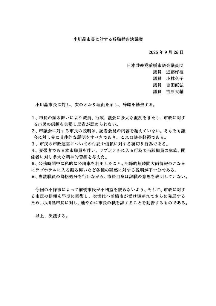 群馬県・前橋市の市長である小川晶氏(42)が、市の幹部職員の既婚男性と公用車で少なくとも"2か月に9回"ラブホテルに通っていたとされる問題。