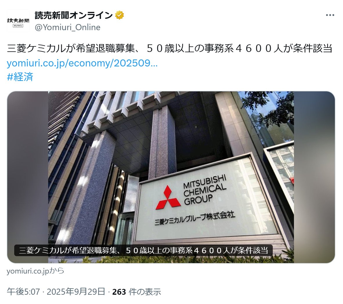 | 三菱ケミカルが希望退職募集、50歳以上の事務系4600人が条件該当 三菱ケミカルグループは29日、子会社で化学事業を手がける三菱ケミカルで、50歳以上かつ勤続3年以上の事務系社員を対象に希望退職を募集すると発表した… (出典:読売新聞オンライン) |