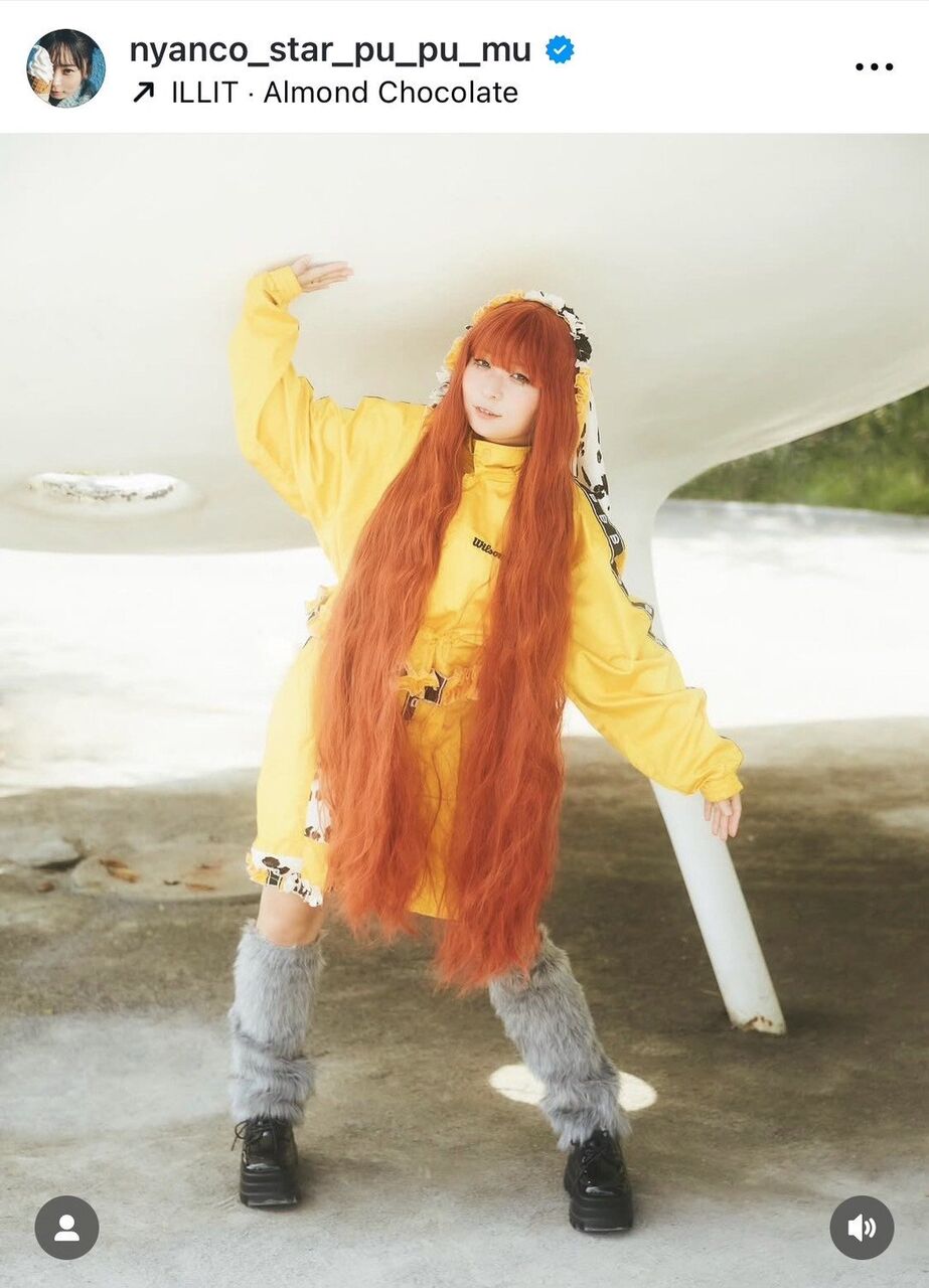 また、もう1パターンのビジュアルも公開。膝まで伸びたオレンジのロングヘアに、イ*ージャージ、グレーのファー調レッグウォーマー、厚底シューズを合わせた、独自のバランス感をもった装いを披露している。「小高さんやみなさんが『アンゴラにはこんなの衣装が似合うのでは!?』というものを考えて新しく作ってきてくれました!」と紹介した。
