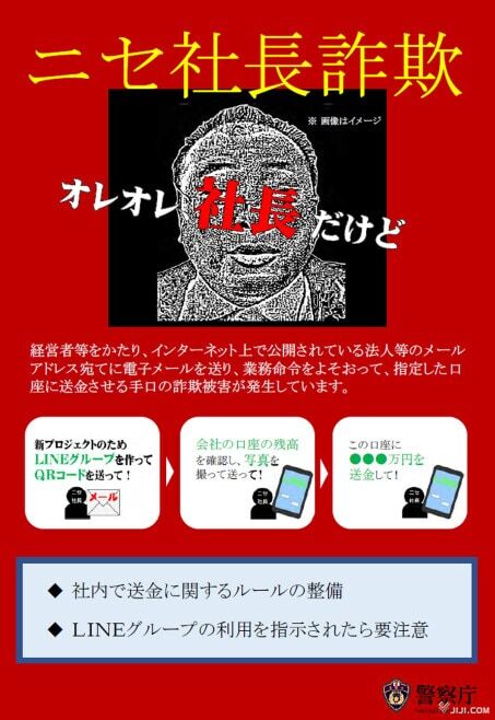 実際の社長や役員の名前をかたって業務連絡を装ったメールを送り、現金をだまし取る手口が増えているとして、警視庁は1月から注意喚起を始めている。