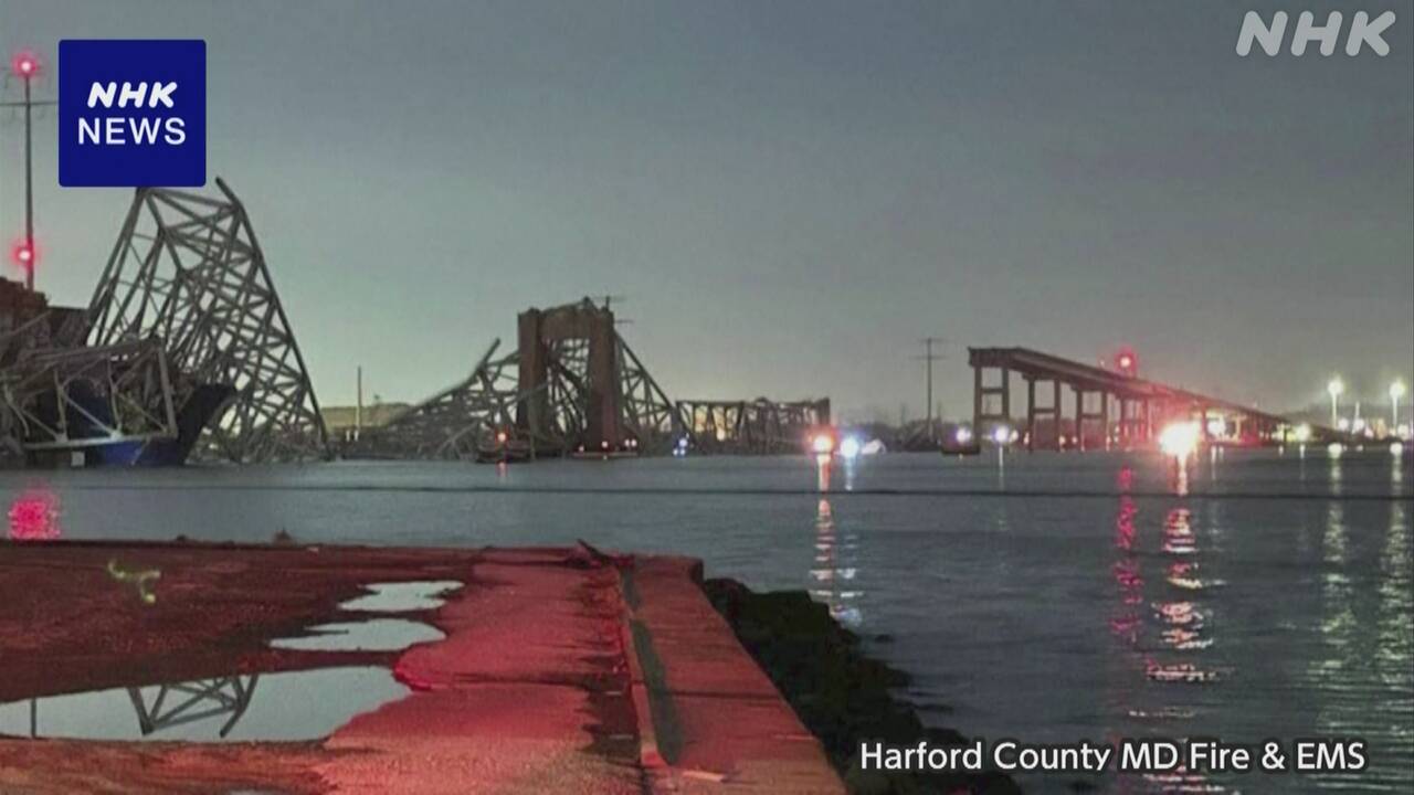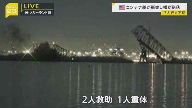 | 貨物船衝突し橋崩落 6人不明 米・メリーランド州ボルティモア …アメリカ東部メリーランド州ボルティモアで貨物船が橋に衝突し、橋が崩落した。 貨物船の停電が衝突につながった可能性があると指摘されている。 現地消防な… (出典:FNNプライムオンライン(フジテレビ系)) |