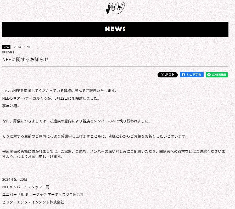 @24newseveryday【速報】4人組バンド「NEE」ギターボーカルのくぅさんが死去 25歳 newseveryday.jp/2024/05/20/%e3…