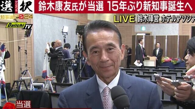 | 【静岡県知事選挙】無所属新人で元浜松市長の鈴木康友氏(66)が初当選 …川勝前知事の辞職に伴う静岡県知事選挙は、無所属の新人で元浜松市長の鈴木康友氏(66)が初当選を果たしました。 26日に投票日を迎えた静岡県知事選挙は即日開票され… (出典:Daiichi-TV(静岡第一テレビ)) |