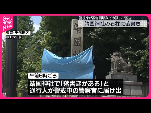 | 靖国神社の石柱に“スプレー”で落書き 警視庁が捜査 …代田区にある靖国神社で「落書きがある」と通行人から警戒中の警察官に届け出がありました。 警察官が駆けつけると、入り口近くにある「靖国神社」と記された石… (出典:日テレNEWS NNN) |