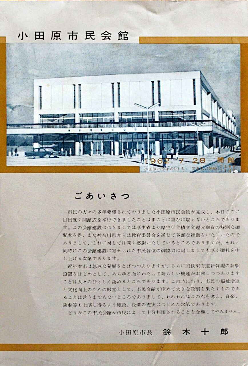 | 小田原市民会館(おだわらしみんかいかん)は、神奈川県小田原市にあった多目的ホール。 1962年(昭和37年)7月28日にまず大ホールが開館。 近隣には当時1400人収容の大規模ホールがなく『8時だョ!全員集合』の公開収録もたびたび行われた。1965年(昭和40年)4月29日に本館が完成した。また、1… 3キロバイト (226 語) - 2023年11月20日 (月) 11:52 |