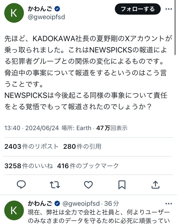 @DJ_KMCBKADOKAWA夏野剛社長のXが乗っ取り被害か NewsPicksの報道が影響と川上量生が報告 kai-you.net/article/89918?…