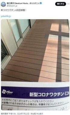 | ホリエモン「死ぬわけねーだろ笑」コロナワクチン反対派を一蹴 6回目の接種を報告「重症化してもいいのかな?笑」 「ホリエモン」こと実業家の堀江貴文氏が2024年7月22日、6回目の新型コロナウイルスのワクチン接種を受けたとXで報告。ワクチン反対派とみられる人… (出典:J-CASTニュース) |