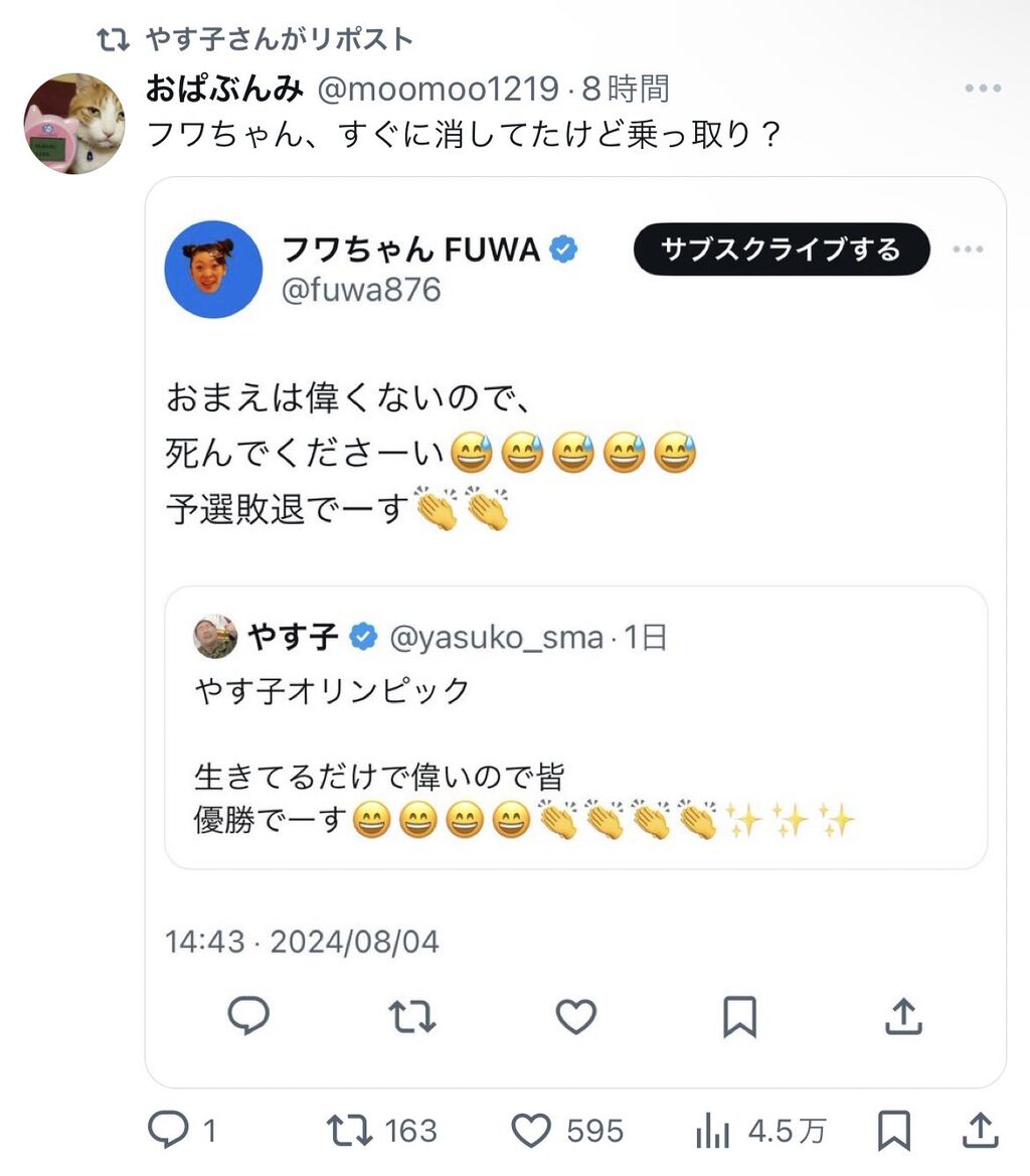 やす子は「言及しないと言ったんですが フワちゃんさんのことめちゃめちゃ許してます! もう終わりましょう!! ただ、今何を投稿しても、何も知らない人たちが勝手な憶測で物事を書かれ、事実と異なる記事が拡散され、悪質なリプをされ、どうしようもできなかったんです 相手への誹謗中傷もやめましょう!」と投稿した。