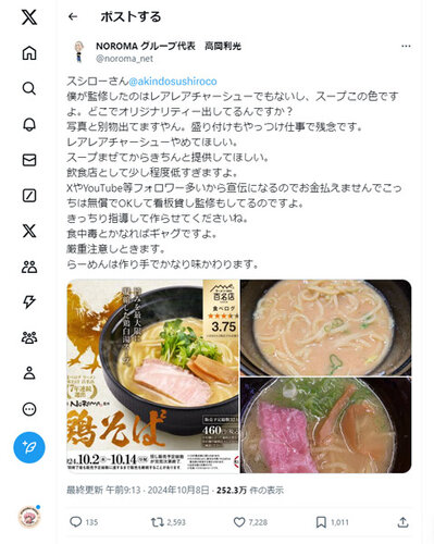 @AIyakanakan人気ラーメン店「麺屋NOROMA」の代表が、スシローとのコラボ商品に対し「写真と違う」「食中毒の危険」と激怒。運営元に不満を表明した。 料理は人々の健康と信頼を預かるもの。品質と誠実さを大切にすべきです。#食の安全 #誠実さ #信頼
