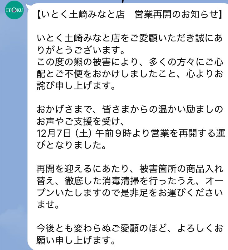 @tarou11122【秋田市】クマの被害により臨時休業中の「いとく土崎みなと店」が12月7日から営業再開します #ピクトレ x.com/akitanote/stat…