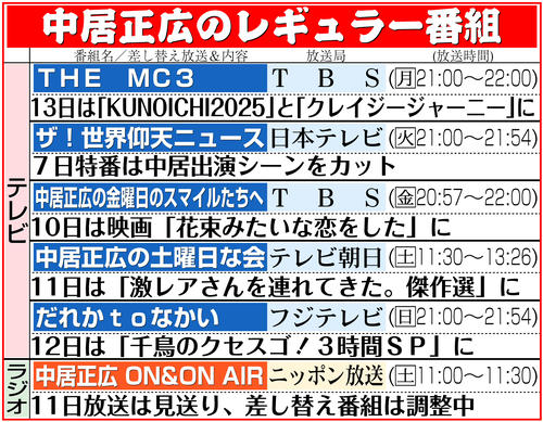 | 中居正広、一連の騒動を謝罪「トラブルがあったことは事実」示談成立「今後の芸能活動支障なく」 …ットされ、他にもTBS系「THE MC3」や「中居正広の金曜日のスマイルたちへ」、テレビ朝日系「中居正広の土曜日な会」などが他番組への差し替えを発表さ… (出典:) |