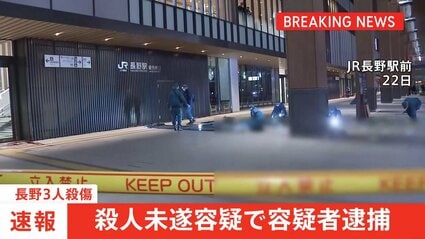 | 【速報】JR長野駅前3人殺傷事件 40代の男を殺人未遂容疑で逮捕 …長野駅前で3人が殺傷された事件で、長野県警は26日朝、40代の男を殺人未遂容疑で逮捕しました。 この事件は1月22日夜、JR長野駅前で男女3人が刃物を持った男… (出典:) |