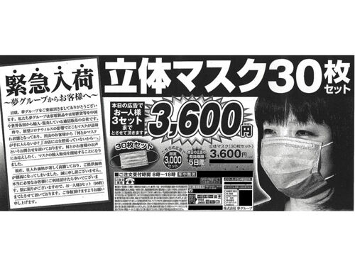 | 通販「夢グループ」に課徴金命令 マスク販売巡り消費者庁 …て、消費者庁は21日、通信販売会社「夢グループ」(東京)に6589万円の課徴金納付命令を出した。 夢グループは取材に「消費者庁の認定には納得いかな… (出典:共同通信) |