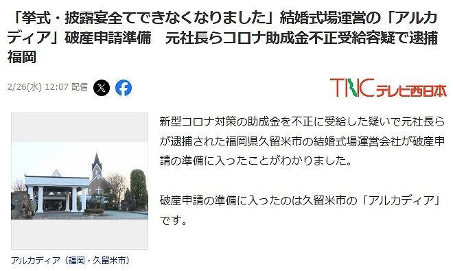@tkhrymnkコロナ雇用調整助成金不正受給で元社長らが逮捕されていた、結婚式場運営の(株)アルカディア(福岡)が破産開始決定 #ヤバ news.yahoo.co.jp/articles/8f631…