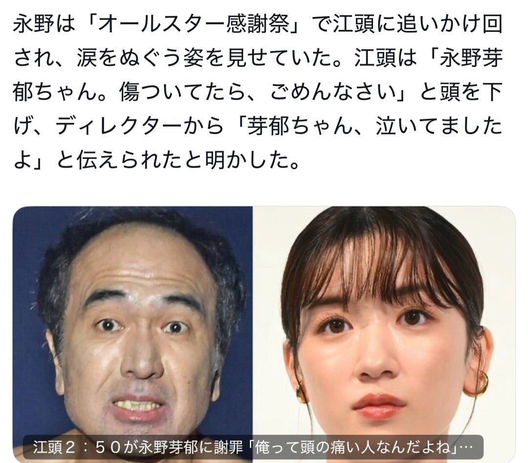 @red_autumn_scarそのために動画で謝罪までした江頭にも謝れよ。 永野芽郁「普通に生理現象として、びっくりして涙が出ただけ」エガちゃんの感謝祭“大暴れ騒動”に言及(スポニチアネックス) #Yahooニュース news.yahoo.co.jp/articles/eef3b…