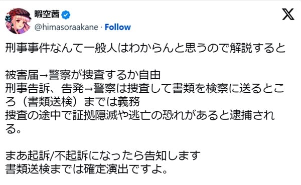 関係者によると、書類送検容疑は2023年3月26日、インターネット投稿サイト「note(ノート)」上に「優しく声かけただけでストーカーみたいな執着を見せる気持ち悪い男性」「性根の腐ったクズ」などと投稿し、大学生の男性を侮辱した、としている。