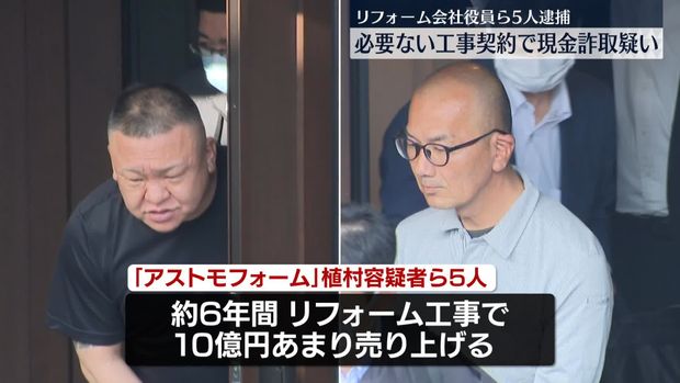 | 約10億円の売り上げ…悪質リフォーム詐欺疑いで会社社長ら5人を逮捕 神奈川県警 …で会社社長の男らが逮捕されました。男らはこれまでに約10億円を売り上げていたということです。 神奈川県厚木市にあるアストモホームの社長・石塚智也容疑… (出典:テレビ朝日系(ANN)) |