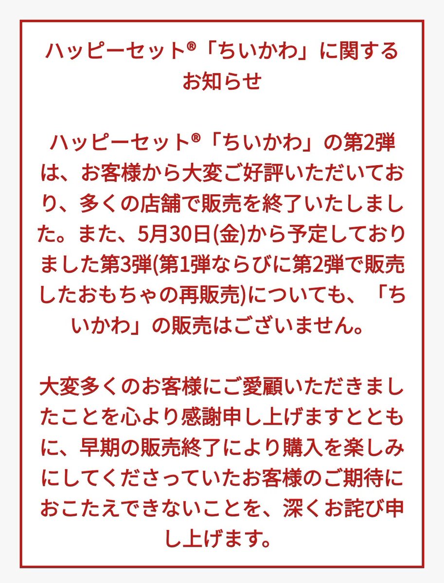 @BSc6SDu5YFvRlFOマクドナルド「深くお詫び」 ハッピーセット「ちいかわ」早期販売終了…実質4日で幕 第3弾もなし(オリコン) news.yahoo.co.jp/articles/e2e64…