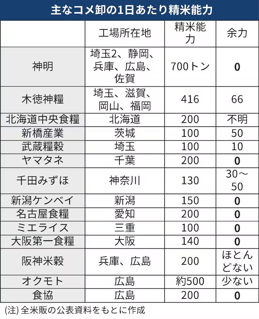 コメ卸で構成する全国米穀販売事業共済協同組合(全米販)は6日、加盟各社の精米余力について初の調査結果を公表した。政府による備蓄米放出によって、大手の神明(東京・中央)やヤマタネは精米工場がフル稼働しており、余力がゼロになった。全国の精米工場の稼働率は9割を超えているとみられ、備蓄米の円滑な流通を阻んでいる。