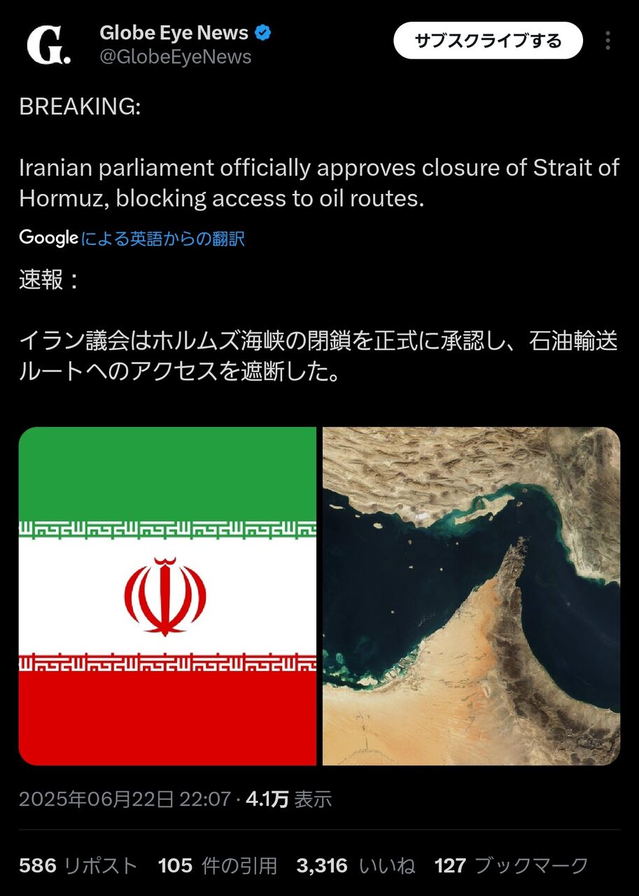 それより「イラン議会ホルムズ海峡の閉鎖を承認」のニュースの方が大きいよ