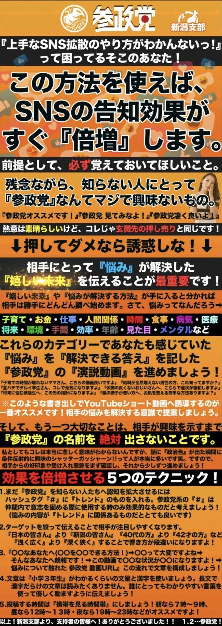 デザインが新興宗教っぽいんだよね 変なキラキラエフェクトとか政党の広報で使わんやろって感じ