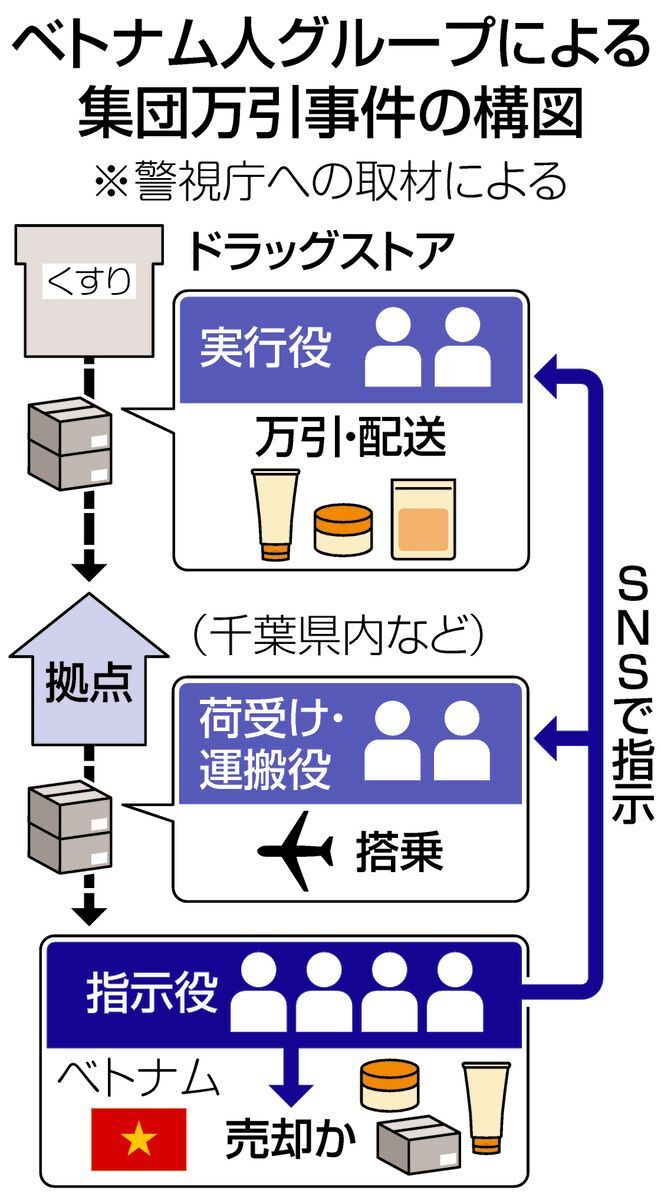 警察庁は、SNSの募集で集まったベトナム人が指示役から指定された化粧品などを万引きし、運搬役が航空機の手荷物などで母国に持ち込む組織的な事件が目立つとの見解を示す。