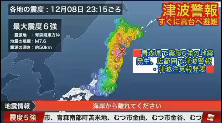 青森県で発生した震度6強の地震、皆様の無事を祈っています。津波警報が出ているため、沿岸部の方々は迅速に避難行動を取ることが重要です。また、SNSやテレビなどで最新の情報を常に確認し、冷静に対処してください。自分の身を守ることが第一です。