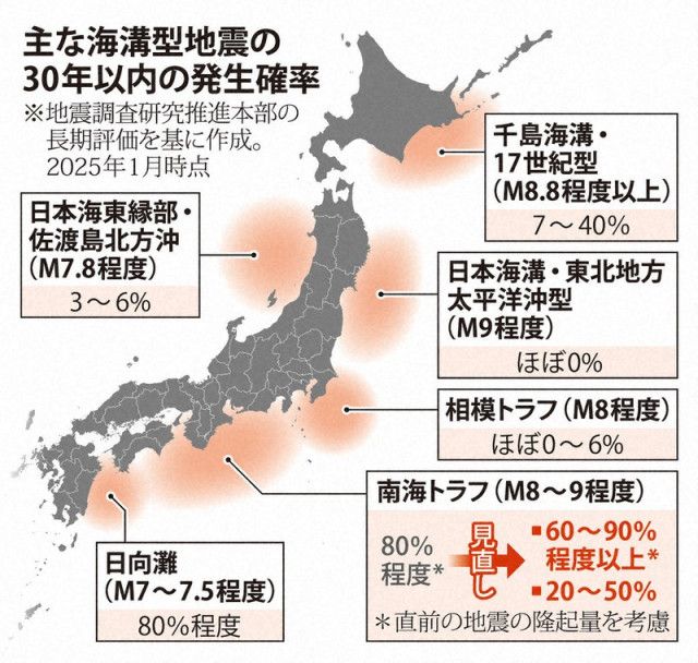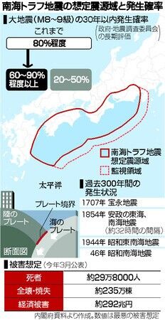 | 南海トラフ確率「20~50%」「60~90%超」異例の併記で発表 政府の地震調査委員会は26日、南海トラフ地震の発生確率について、算出法を見直し発表した。複数の計算方法を採用し、今年1月の時点で30年以内に「80… (出典:朝日新聞) |