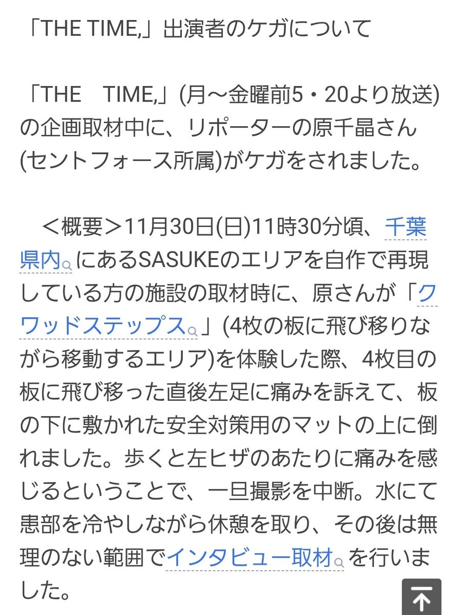 「THE TIME,」(月~金曜前5・20より放送)の企画取材中に、リポーターの原千晶さん(セントフォース所属)がケガをされました。