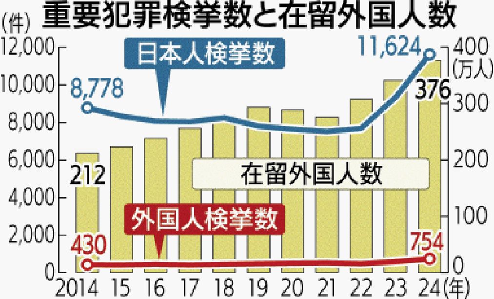 吉川氏が言及した外国人の重要犯罪(殺人、強盗、放火、不同意性交、略取、誘拐、人身売買、不同意わいせつ)検挙は24年に754件と、10年間で75%増えている(警察庁統計)。在留外国人の増加率とほぼ等しく、外国人が犯罪を起こしやすいとは読み取れない。この間、日本人の人口は4%減っている(総務省統計 https://www.stat.go.jp/data/jinsui/2.html#annual)のに、検挙は24年に1万1624件と32%増えている(警察庁統計)。