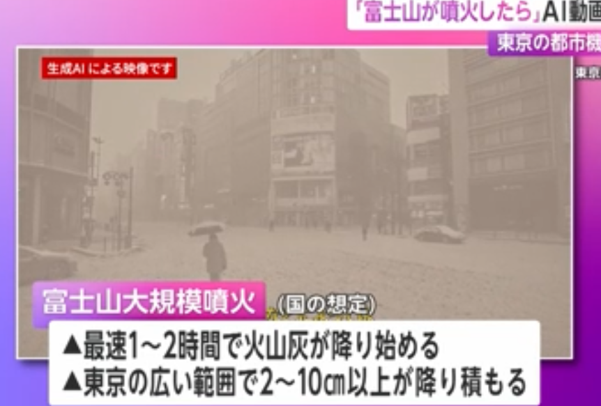 | 「富士山が噴火したら」東京都がAI動画を公開…帰宅困難、停電や通信障害など都市機能に深刻な影響が出ることを再現 - dメニューニュース 「富士山が噴火したら」東京都がAI動画を公開…帰宅困難、停電や通信障害など都市機能に深刻な影響が出ることを再現 dメニューニュース (出典:dメニューニュース) |