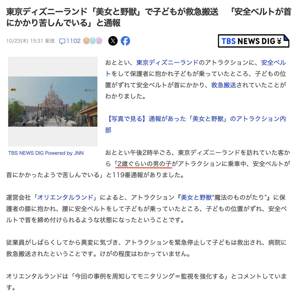 東京ディズニーランド「美女と野獣」で子どもが救急搬送 「安全ベルトが首にかかり苦しんでいる」と通報 https://topics.smt.docomo.ne.jp/article/tbs/nation/tbs-2245627